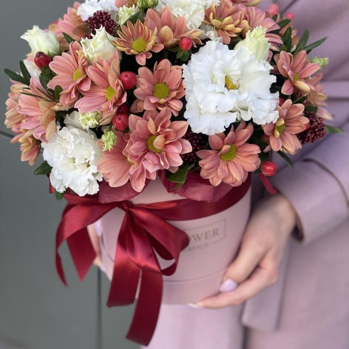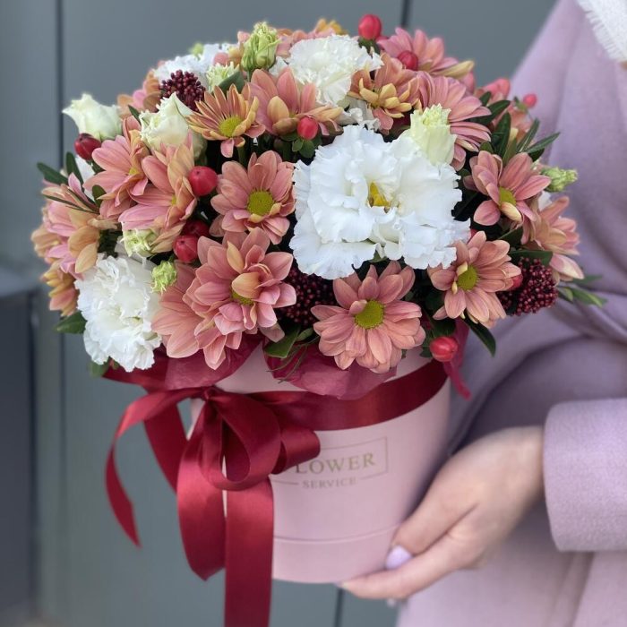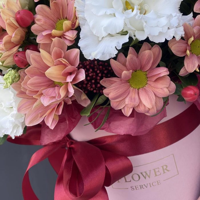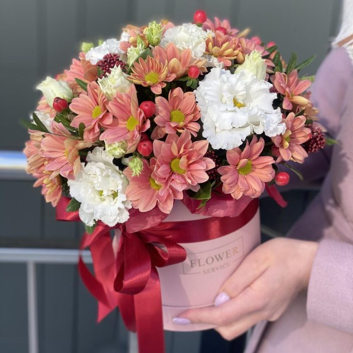 Коробка с цветами из ромашковой персиковой хризантемы, гиперикума, скиммии, зелени и кружевной эустомы !