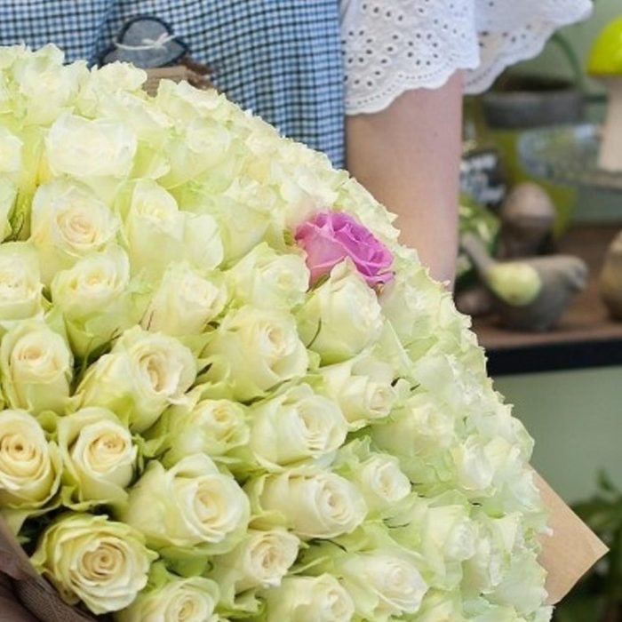 Роза Россия 50 см – 101 шт.Крафт – 3 шт.Лента атласная – 1 шт.