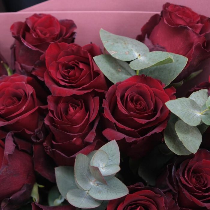 15 красных роз с веточками эвкалипта