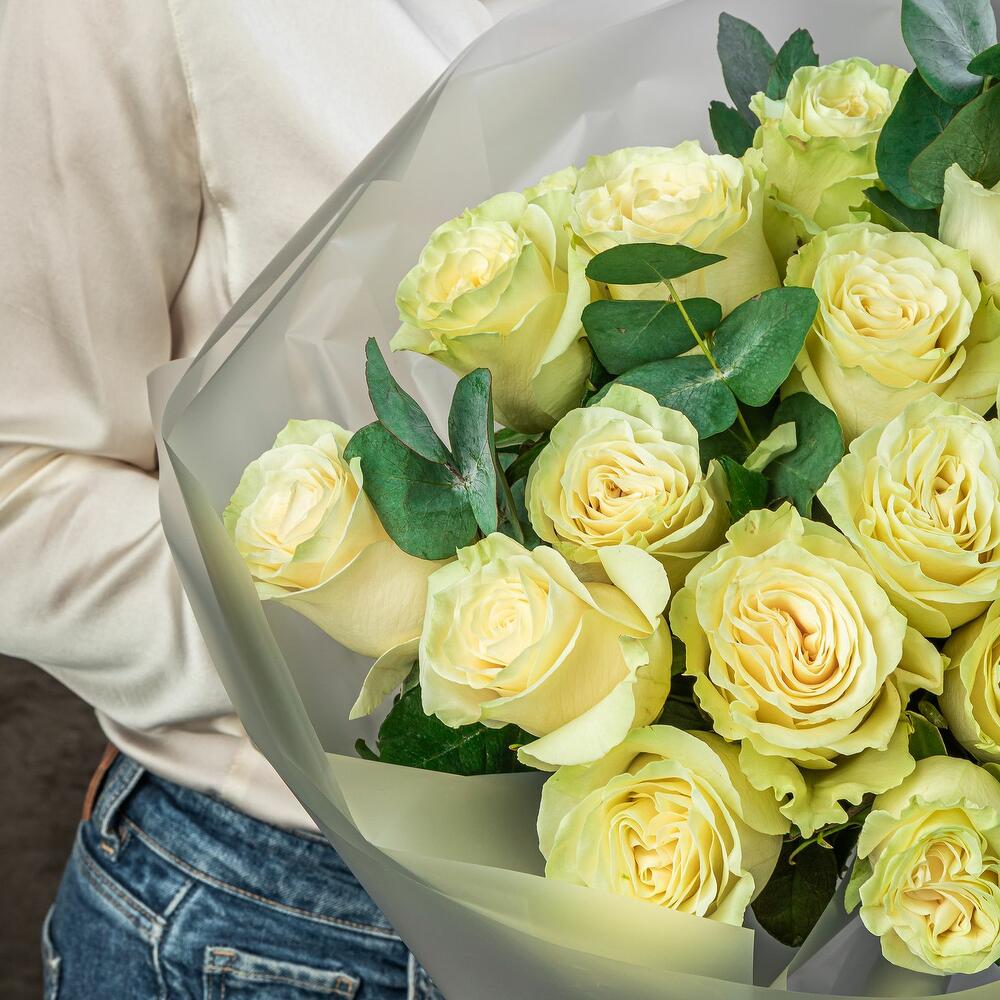 Букет “70” из белой розы с эвкалиптом