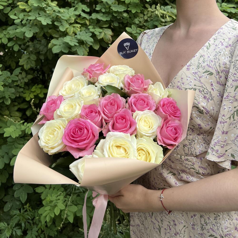 Букет из 21 белой и розовой розы 50 см