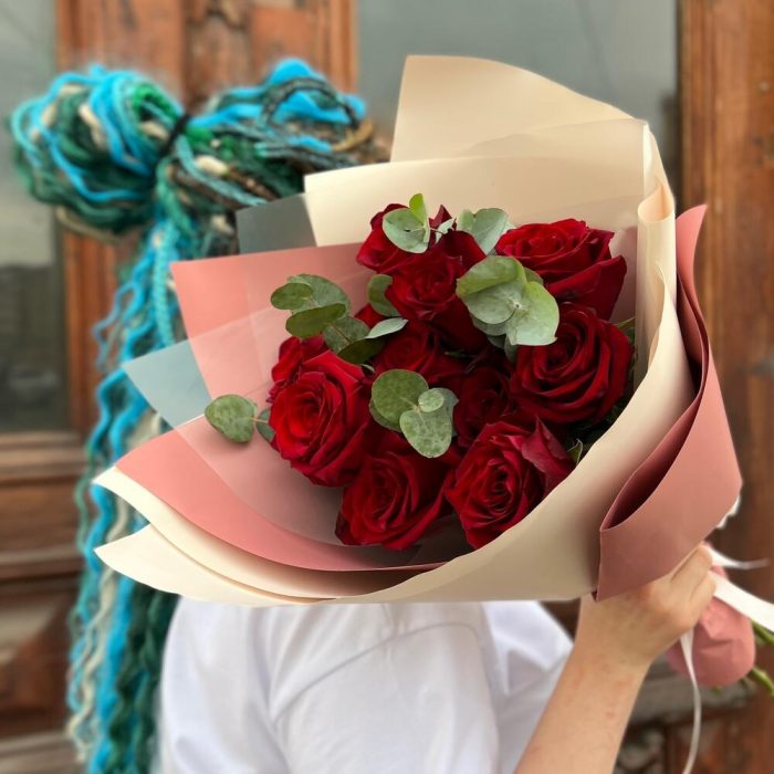 Эвкалипт – 3 шт.Лента атласная – 1 шт.Роза Эксплорер – 11 шт.Пленка дизайнерская – 2 шт.