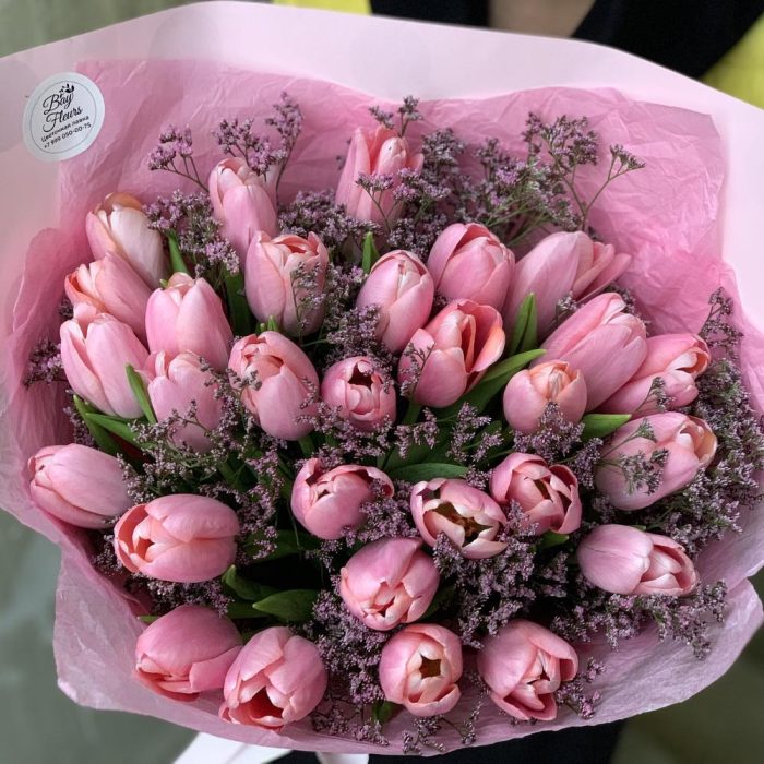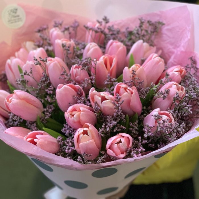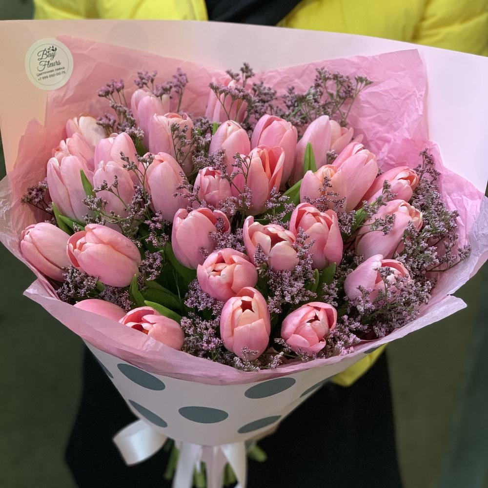 Тюльпан – 25 шт.Лимониум – 3 шт.Упаковка дизайнерская – 1 шт.Лента атласная – 1 шт.